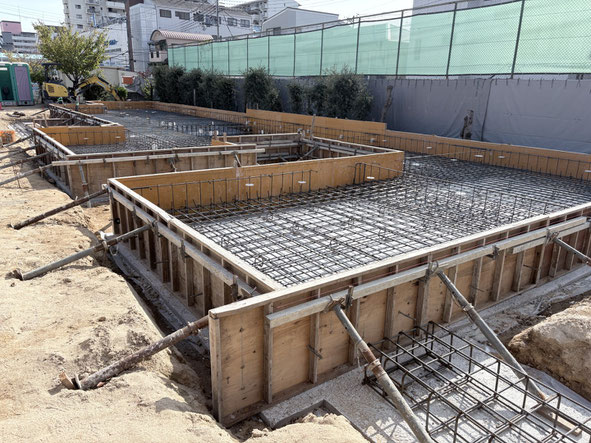 木造非住宅建築である小学校施設の現場が着々と進んでいます。本日は基礎の配筋検査です。さすがに基礎は木造というわけにはいかないので、鉄筋とコンクリートで構成されているのですが、特に鉄筋の間隔やかぶり厚さ、定着長さなどが重要で、入念にチェックすることが大切です。